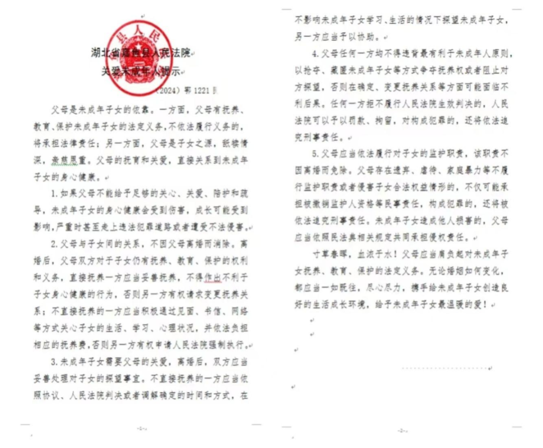 日前,嘉魚縣人民法院簰洲灣法庭在審理一起撫養費糾紛案件時,向孩子母親王希(化名)、父親張華(化名)發出《嘉魚縣人民法院決定書(家庭教育指導令)》和《嘉魚縣人民法院關愛未成年人提示》。據悉,這是2024年4月10日《最高人民法院關于在涉及未成年子女的離婚案件中開展“關愛未成年人提示”工作的意見》實施后,嘉魚縣人民法院首份制發的關愛未成年人提示。