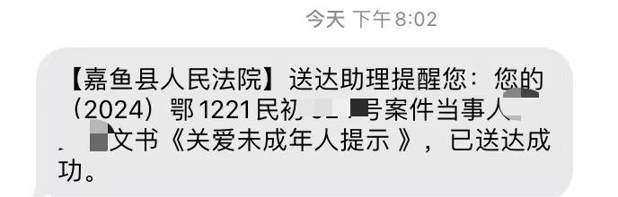 最后,法庭通過電子送達方式向二人發出了《嘉魚縣人民法院關愛未成年人提示》,進一步要求張華、王希肩負起對未成年子女撫養、教育、保護的法定義務。無論婚姻如何變化,都應履行好家庭教育責任,承擔起做父母的義務。